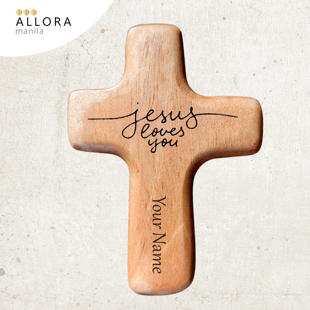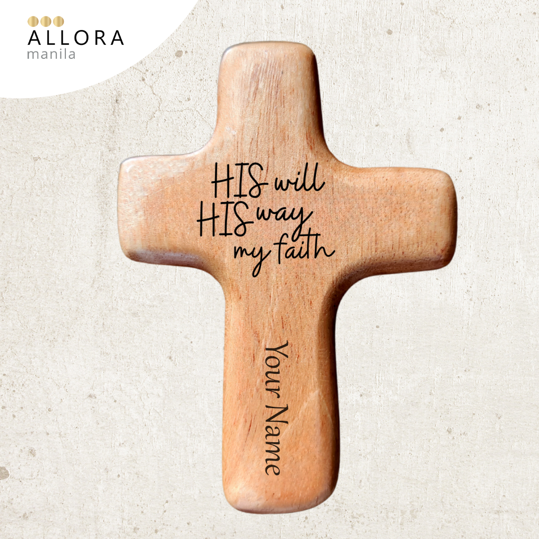 The light-colored holding cross is made of mahogany wood while the dark one is made of acacia wood.